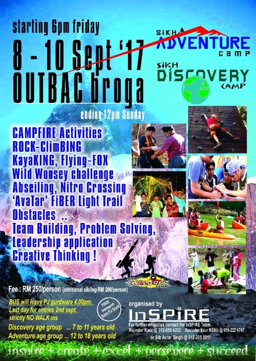 Sikh Discovery Camp (7-11 years old) | Sikh Adventure Camp (12-18 years old) | Fee: RM250 (additional sibling RM200) | Place: Outbac Campsite in Broga, Semenyih | 8-10 Sept 2017 | Organiser: Inspire, Malaysia | To join: Call or Whatsapp 012-2055011