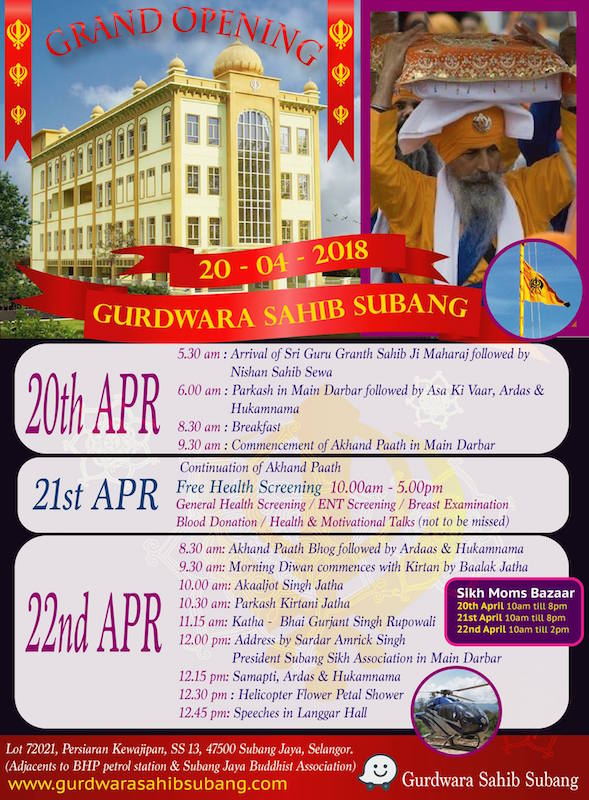 Gurdwara Sahib Subang opening will take place with an akhand path that kick starts on 20 April (Friday) and ends on 22 April (Sunday).