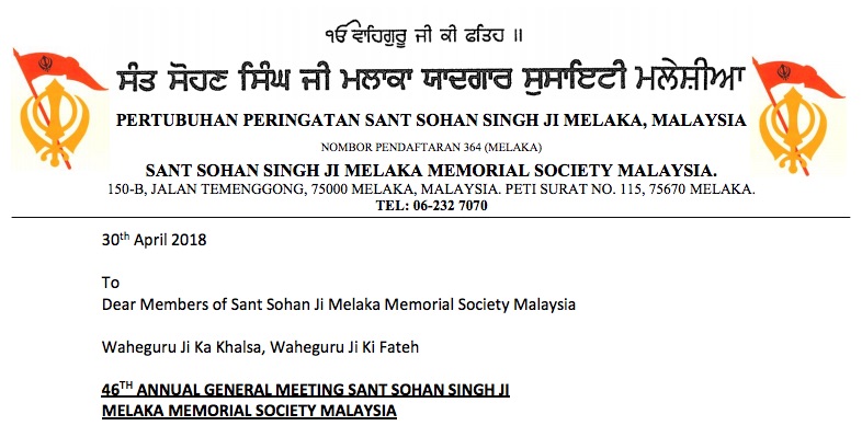 46TH ANNUAL GENERAL MEETING SANT SOHAN SINGH JI MELAKA MEMORIAL SOCIETY MALAYSIA