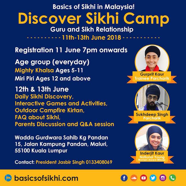 Discover Sikhi Camp (11-13 June) | Venue: Wadda Gurdwara Sahib Kampung Pandan, Kuala Lumpur | Date: 11 June 2018, 7pm onwards | Organised by Gurdwara and Basics of Sikhi, Malaysia. Sikh camp conducted by Veer Sukhdeep Singh and team from Basics Of Sikhi UK. Age: 5-18 years. Contact: Jasbir Singh 013-3408069