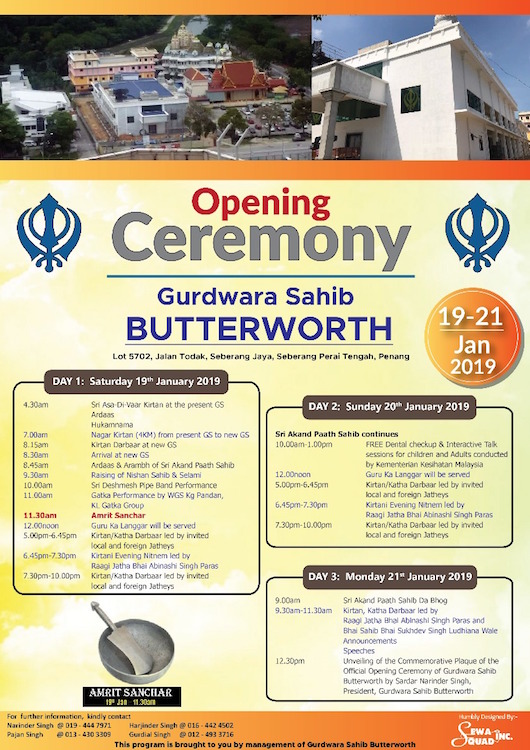 A three-day programme starting from Jan 19 (Saturday) has been prepared for the opening ceremony of the new home for Gurdwara Sahib Butterworth (GSB) at Lot 5702, Jalan Todak, Seberang Jaya, Seberang Perai Tengah in Penang.