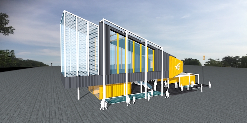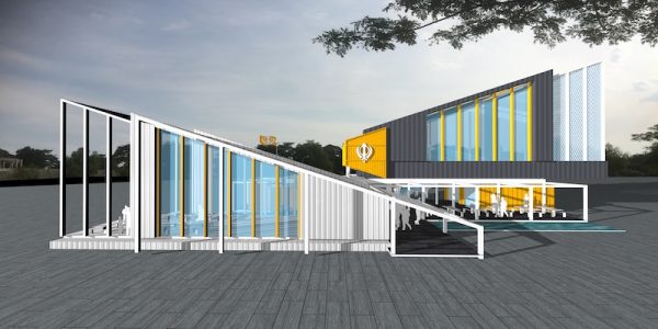 The ground floor is an open, ‘free-flowing’ platform, meaning that no permanent walls are built to house any specific functions such as offices, storerooms and the kitchen. These areas are defined by the incorporation of mobile metal cabins, seen as large metal boxes in orange, like individual shipping containers, that can be ‘installed’ and removed as needed. This design approach allows for flexibility in the usage of the space in the long run, and can allow for a multitude of functions and additions to take place over time as and when required.