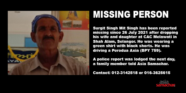 Missing Person | Puchong, Malaysia: Surgit Singh Mit Singh has been reported missing since 26 July 2021 after dropping his wife and daughter at CAC Melawati in Shah Alam, Selangor. He was wearing a green shirt with black shorts. He was driving a Perodua Axia (BPY 759).