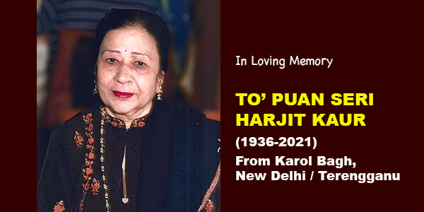 To’ Puan Seri Harjit Kaur, wife of Dato’ Seri Dr Kuljit Singh (Kuala Terengganu), left for her heavenly abode on 22 August 2021.