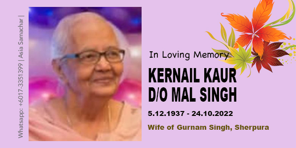 With heavy hearts we inform the passing of Kernail Kaur d/o Mal Singh this morning, Monday, 24th October 2022 at Petaling Jaya leaving behind: