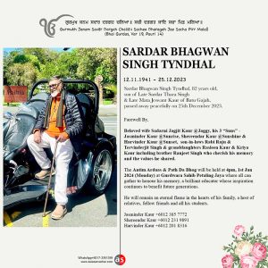 Sardar Bhagwan Singh Tyndhal, 82 years old, son of Late Sardar Thara Singh & Late Mata Jeswant Kaur of Batu Gajah, passed away peacefully on 25th December 2023.