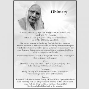 Last Respect: Thursday, 23 May 2024, 10am – 10pm, at 16, Jalan Anjyung U8/34, Bukit Jelutong, 40150 Shah Alam, Selangor.