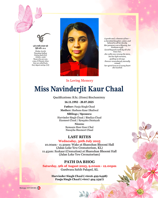 10.00am – 11.30am: Wake at Shamshan Bhoomi Hall (Jalan Loke Yew Crematorium, KL)