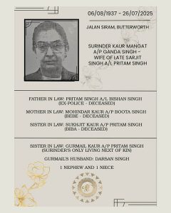 Sister in Law: Sukhjit Kaur A/P Pritam Singh (Biba – Deceased)