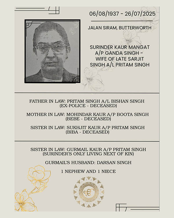 Surinder Kaur Mangat (1937 – 2025), Jalan Siram, Butterworth
