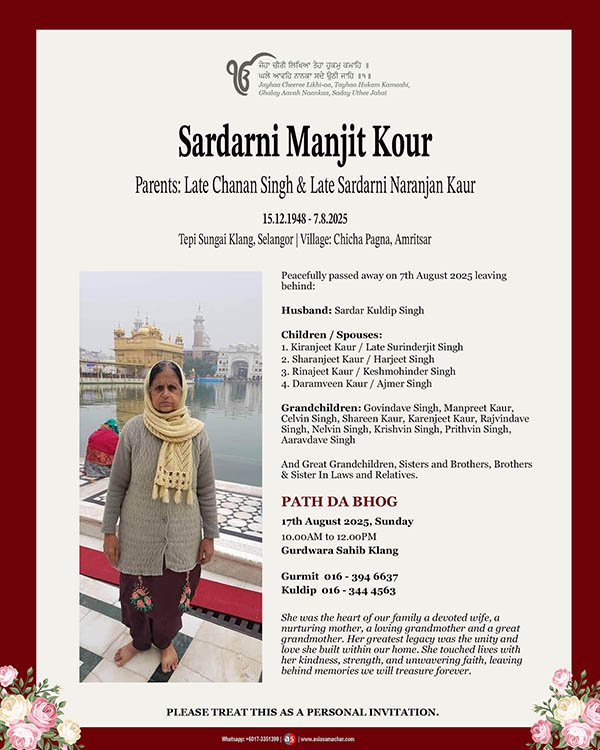 ASIA SAMACHAR is an online newspaper for Sikhs / Punjabis in Southeast Asia and beyond. You can leave your comments at our website, Facebook, Twitter, and Instagram. We will delete comments we deem offensive or potentially libelous. You can reach us via WhatsApp +6017-335-1399 or email: asia.samachar@gmail.com. For obituary announcements, click here