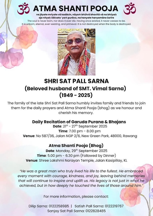 The family of the late Shri Sat Pall Sarna humbly invites family and friends to join them for the daily prayers and Atma Shanti Pooja (bhog) as we honour and cherish his memory.