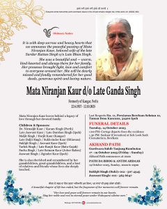 It is with deep sorrow and heavy hearts that we announce the peaceful passing of Mata Niranjan Kaur, beloved wife of the late Sardar Rattan Singh s/o Late Bhan Singh.