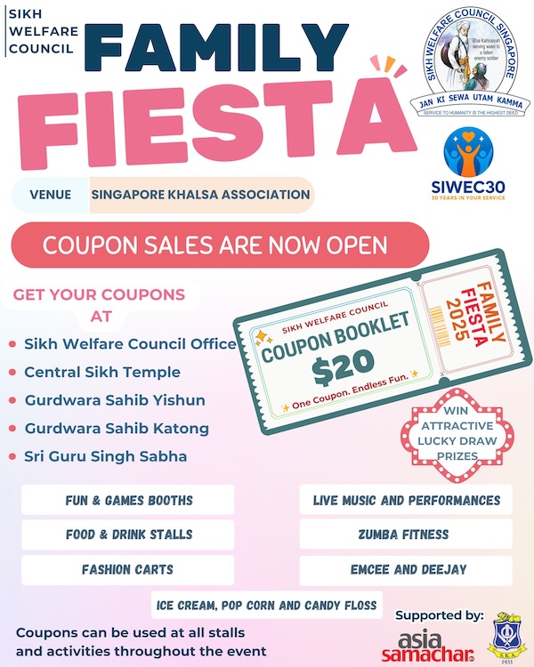 Event | Singapore: Sikh Welfare Council (SIWEC) will be organizing the Family Fiesta 2025 on 29 November 2025 (Saturday) at Singapore Khalsa Association. SIWEC will be celebrating 30 years of its existence with a day full of food, fun and festive cheer. Asia Samachar is proud to support as the media partner.