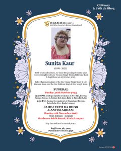 With profound sadness, we share the passing of Sunita Kaur beloved daughter of Late Swaran Singh Thandal (Income Tax) & Jagjit Kaur on 25 October 2025.