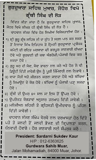 Iklan Jawatan Kosong Granthi untuk Gurdwara Sahib Muar, Johor