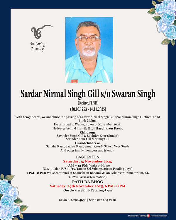 ASIA SAMACHAR is an online newspaper for Sikhs / Punjabis in Southeast Asia and beyond. You can leave your comments at our website, Facebook, Twitter, and Instagram. We will delete comments we deem offensive or potentially libelous. You can reach us via WhatsApp +6017-335-1399 or email: asia.samachar@gmail.com. For obituary announcements, click here