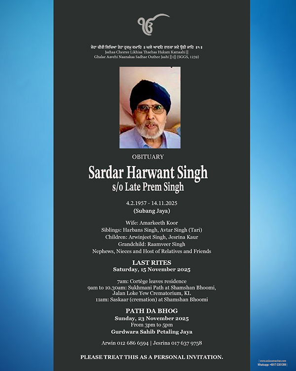 ASIA SAMACHAR is an online newspaper for Sikhs / Punjabis in Southeast Asia and beyond. You can leave your comments at our website, Facebook, Twitter, and Instagram. We will delete comments we deem offensive or potentially libelous. You can reach us via WhatsApp +6017-335-1399 or email: asia.samachar@gmail.com. For obituary announcements, click here