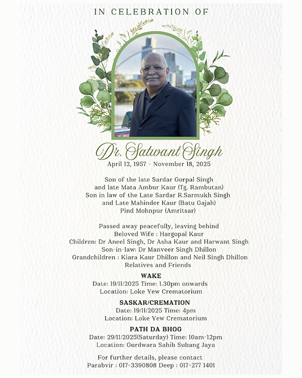 ASIA SAMACHAR is an online newspaper for Sikhs / Punjabis in Southeast Asia and beyond. You can leave your comments at our website, Facebook, Twitter, and Instagram. We will delete comments we deem offensive or potentially libelous. You can reach us via WhatsApp +6017-335-1399 or email: asia.samachar@gmail.com. For obituary announcements, click here