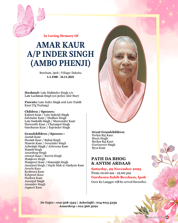 Amar Kaur (Ambo Phenji) (1940 – 2025), Bercham, Ipoh