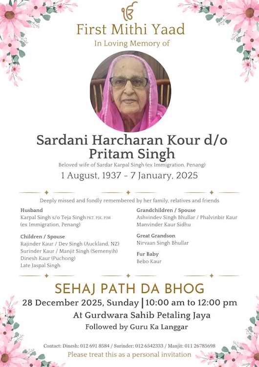 ASIA SAMACHAR is an online newspaper for Sikhs / Punjabis in Southeast Asia and beyond. You can leave your comments at our website, Facebook, Twitter, and Instagram. We will delete comments we deem offensive or potentially libelous. You can reach us via WhatsApp +6017-335-1399 or email: asia.samachar@gmail.com. For obituary announcements, click here