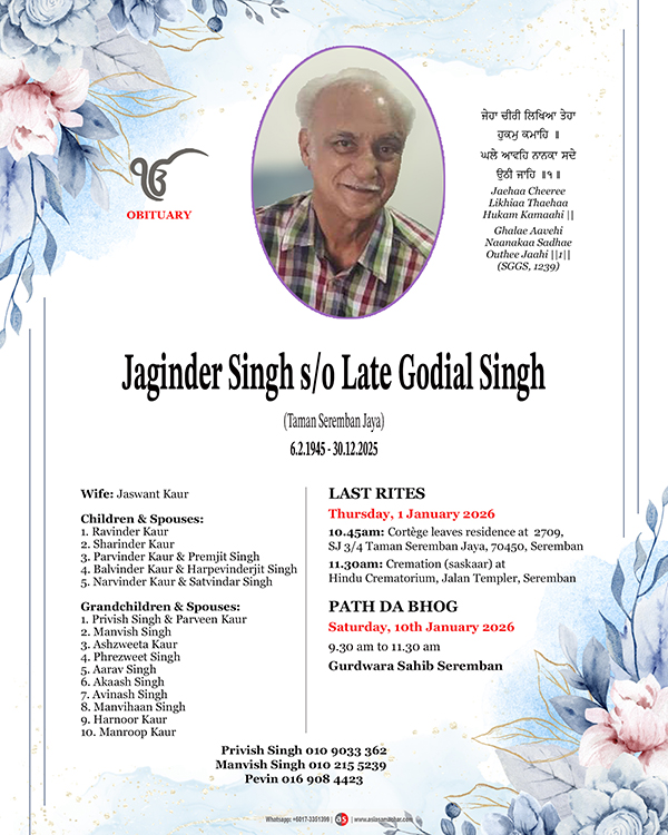 ASIA SAMACHAR is an online newspaper for Sikhs / Punjabis in Southeast Asia and beyond. You can leave your comments at our website, Facebook, Twitter, and Instagram. We will delete comments we deem offensive or potentially libelous. You can reach us via WhatsApp +6017-335-1399 or email: asia.samachar@gmail.com. For obituary announcements, click here