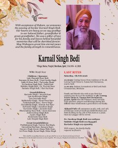 With acceptance of Hukam, we announce the passing of Sardar Karnail Singh Bedi. Our hearts are heavy as we say goodbye to our beloved father, grandfather & great-grandfather. He was a pillar of love for his family and leaves behind beautiful memories that will be cherished forever. May Waheguru grant him eternal peace and the family strength in remembrance.
