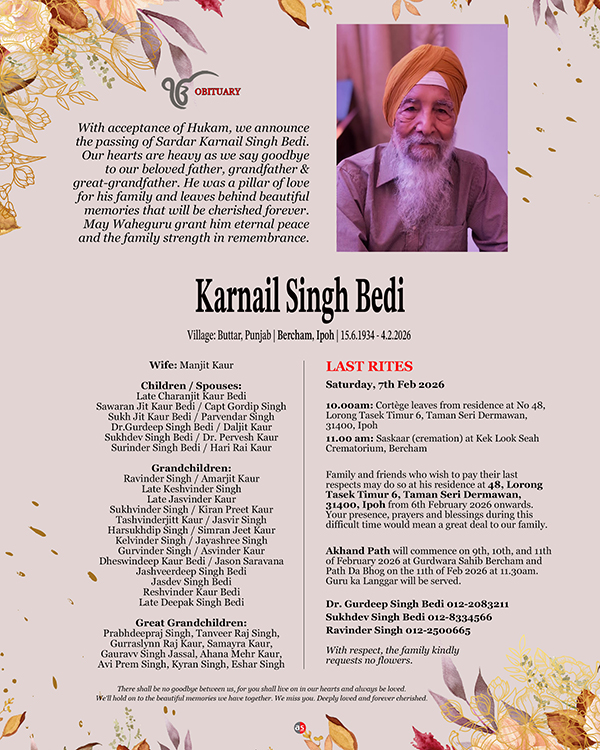 Family and friends who wish to pay their last respects may do so at his residence at 48, Lorong Tasek Timur 6, Taman Seri Dermawan, 31400, Ipoh from 6th February 2026 onwards. Your presence, prayers and blessings during this difficult time would mean a great deal to our family.