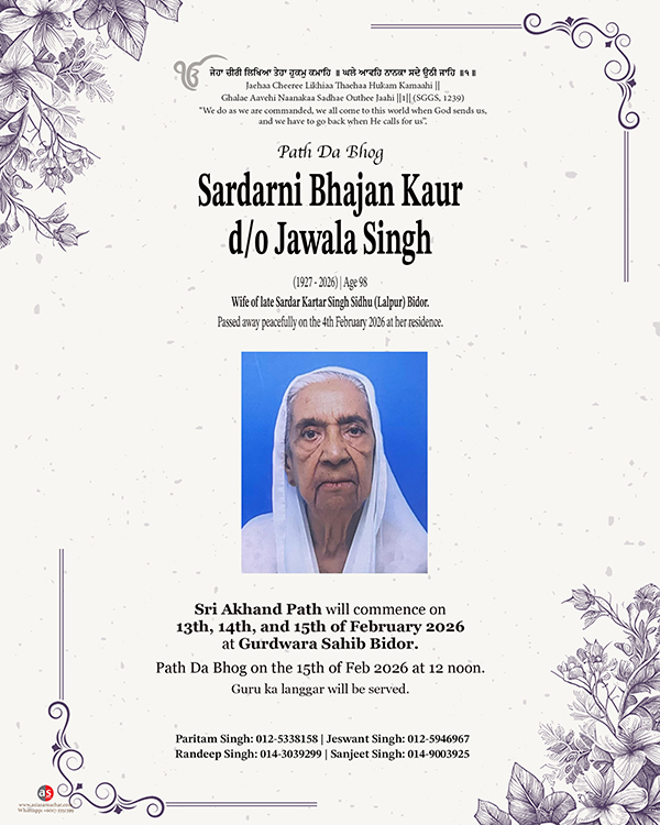 Sri Akhand Path will commence on 13th, 14th, and 15th of February 2026 at Gurdwara Sahib Bidor and Path Da Bhog on the 15th of Feb 2026 at 12 noon. Guru ka langgar will be served.