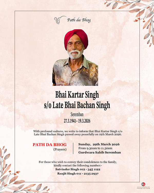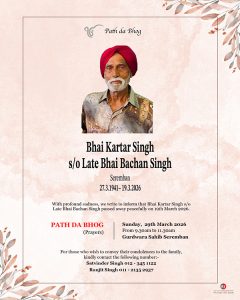 With profound sadness, we write to inform that Bhai Kartar Singh s/o Late Bhai Bachan Singh passed away peacefully on 19th March 2026.
