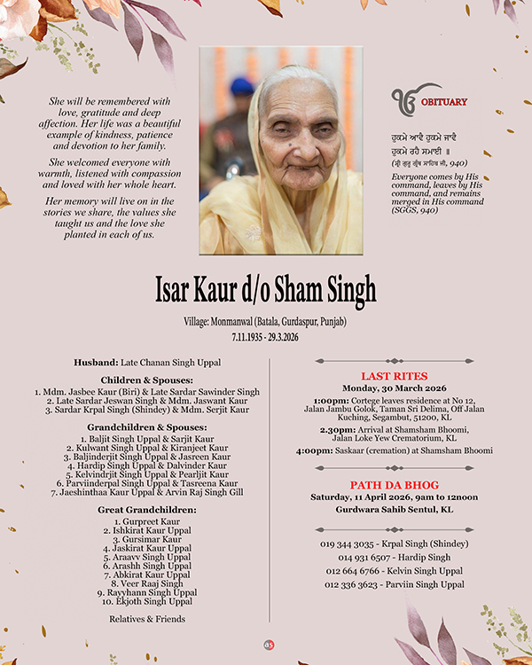 ASIA SAMACHAR is an online newspaper for Sikhs / Punjabis in Southeast Asia and beyond. You can leave your comments at our website, Facebook, Twitter, and Instagram. We will delete comments we deem offensive or potentially libelous. You can reach us via WhatsApp +6017-335-1399 or email: asia.samachar@gmail.com. For obituary announcements, click here