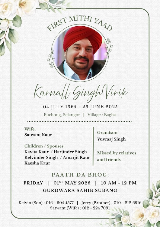 With the blessings of Waheguru, we humbly invite you and your family to join us for the First Mitthi Yaad of our beloved Late Sardar Karnall Singh Virik