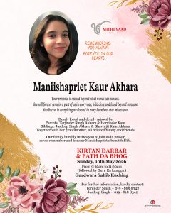 Our family humbly invites you to join us in prayer as we remember and honour Maniishapriet’s beautiful life.