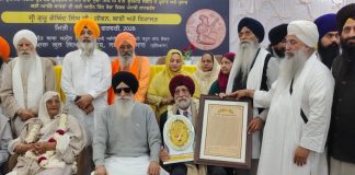Santokh Randhawa (seated, 3rd from left) honored at an international conference organised by Jawaddi Taksaal in Ludhiana, Panjab