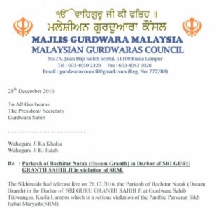 “The Sikhinside had telecast live on 26.12.2016, the Parkash of Bachitar Natak (Dasam Granth) in the Darbar of SRI GURU GRANTH SAHIB JI at Gurdwara Sahib Titiwangsa, Kuala Lumpur which is a serious violation of the Panthic Parvanat Sikh Rehat Maryada (SRM)”.