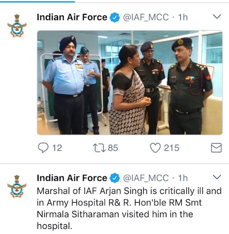 Prime Minister Narendra Modi, Defence Minister Nirmala Sitharaman and Air Marshal Birender Singh Dhanoa were among the top Indian politician to have paid him a visit.