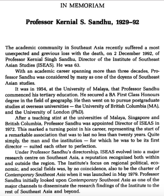 “Professor Sandhu was one of the brightest minds of his time. He had an astute understanding of regional and global affairs. A wonderful intellectual, he was much- sought after by local and international institutions for his views on geo-political issues confronting Singapore and the region at that time. Above all, he was generous with funding, advice and time – he was always willing to help fellow colleagues and young academics who wanted to understand his thoughts and perspectives. Professor Sandhu spent much of his life at ISEAS and transformed it into one of the most, if not the most, respected institutions in Southeast Asia. When I took over as Director of ISEAS in 2002, some 10 years after Professor Sandhu, I inherited an organisation that owed so much of its progress to him. His unfortunate demise in 1992 shocked all of us who knew him. He left a huge void in the academic arena.“