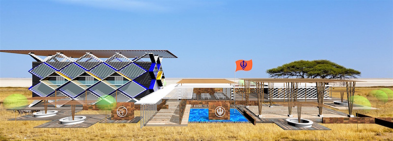The Gurdwara is laid out across the flat landscapes of the savanna, expressing the horizontality of the site and the connection the Gurdwara has with the environment. The entrance is marked in the middle of the complex and leads to the Darbar Sahib on the left and the open multi-functional hall on the right.