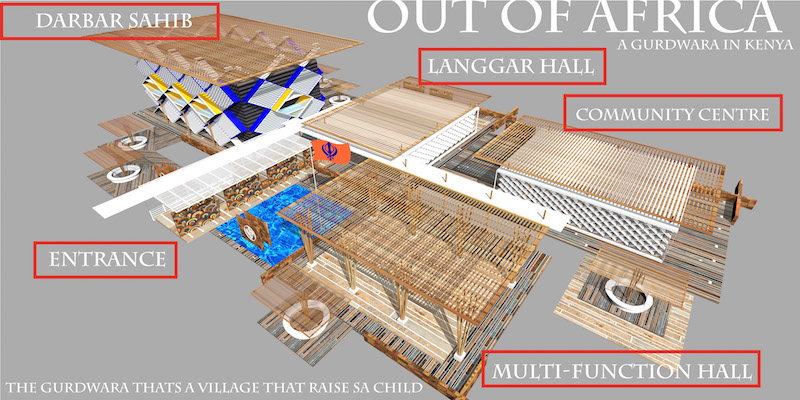 The design idea behind this Gurdwara, imaginatively located in Kenya, is based on the literal idea of what a village consists of, in terms of the general layout, and in terms of open spaces connected through various public-centric activities such classes for learning, open halls for physical activities and so forth. In terms of its appearance, it primarily a design that incorporates timber and stone into its construction, as these natural materials are well identified and celebrated with the ravishing landscapes of the savannas of Africa. All the individual structures that make the Gurdwara complex are well shaded with timber canopies as part of the aesthetics and lends a practical aspect to the design the keep the building cool.