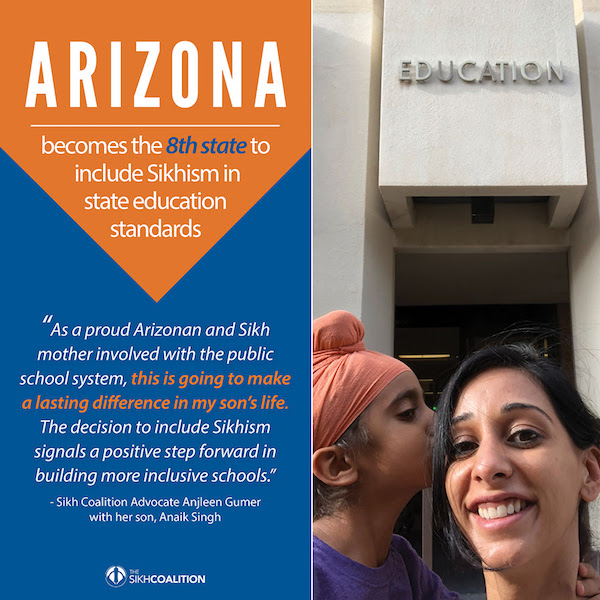 “We are thrilled that Arizona has taken this step as we continue our efforts to create Sikh awareness in our nation’s classrooms for generations to come,” said Sikh Coalition Education Director Pritpal Kaur. “Arizona now becomes the eighth state to incorporate these critical updates into their standards as we continue our work to combat bigotry and increase religious literacy across the United States.”