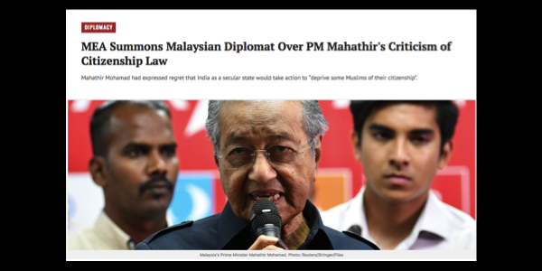 On Saturday, Malaysia’s acting head of mission was summoned for India to lodge a protest over remarks made by Prime Minister Mahathir Mohamed against the Citizenship (Amendment) Act, 2019, reports The Wire.