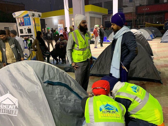 It’s almost midnight with the temperature being 12C and our team is constantly adding tents to the tent city we have set up at Singhu Border for the farmers. – Text/Photo: Hemkunt Foundation via Twitter @Hemkunt_Fdn