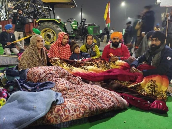 To be surrounded by thousands of armed forces, with every chance of being beaten and broken, there were families like these who refused to leave Ghazipur, ready to take a bullet in their chests. [Farmer leader Rakesh] Tikait was not the only hero of last night. All those who stayed back, they are heroes too. Who cuts off drinking water supply to a protest site with elders and children ! Water bottles sent in private cars were not allowed too. Is this how you break a protest ? For a country driven on faith, no one believes in karma. – Text/Photo by Gurpreet Wasi, shared on 29 Jan 2021