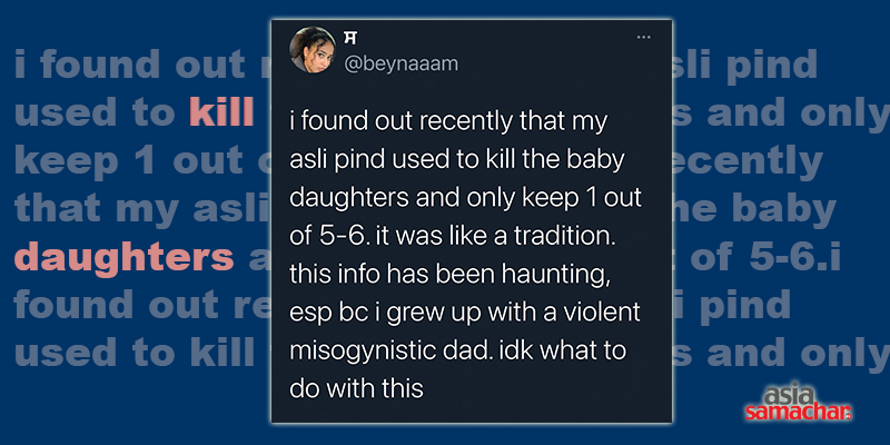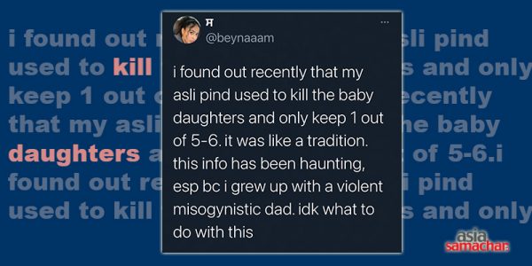 “I found out recently that my asli pind used to kill the baby daughters and only keep 1 out of 5-6. It was like a tradition. This info has been haunting, especially because I grew up with a violent misogynistic dad. I would like to know what to do with this.
