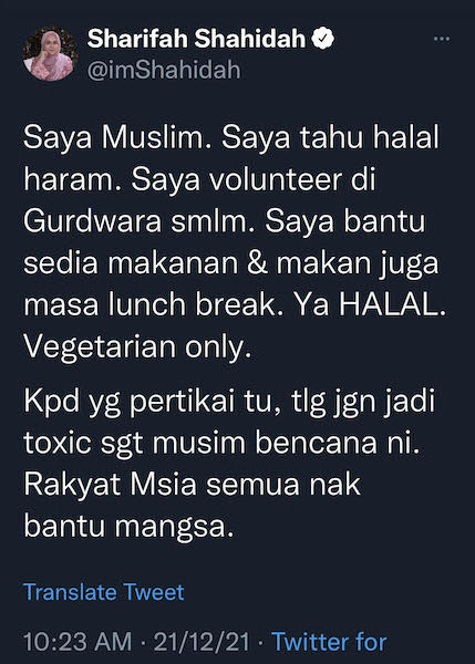 “Saya Muslim. Saya tahu halal haram. Saya volunteer di Gurdwara smlm. Saya bantu sedia makanan & makan juga masa lunch break. Ya HALAL. Vegetarian only. Kpd yg pertikai tu, tlg jgn jadi toxic sgt musim bencana ni. Rakyat Msia semua nak bantu mangsa,” tweeted Sharifah Shahidah, a former deputy secretary-general of political party PKR.