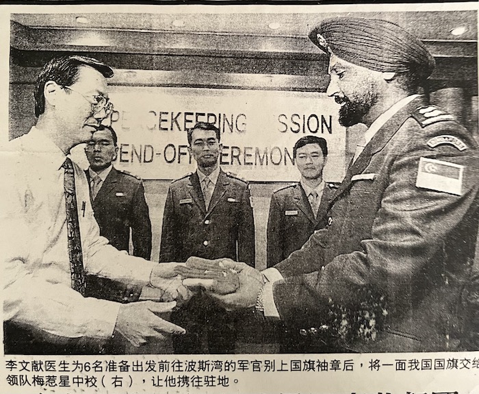 Mejar Singh Gill receiving the state flag from Singapore defence minister for UNIKOM Mission, 1995 – Photo: Supplied (Chinese newspaper cutting)