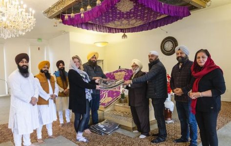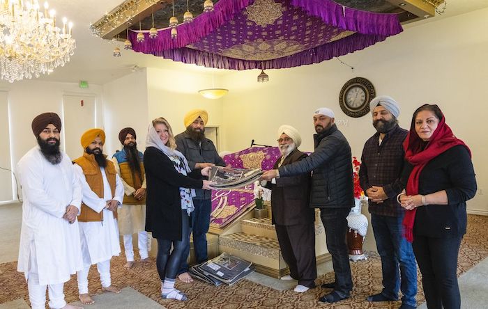 Members of the Sikh community present wool blankets to Carin Crowe from Habitat for Humanity to distribute to the help the unsheltered stay warm, during a blessing ceremony at the gurdwara in Taylorsville, on Thursday, Dec. 23, 2021 – Photo: Rick Egan / The Salt Lake Tribune