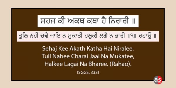 SAINT KABIR says the state of enlightened consciousness (sehaj awastha) is very unique and exceptional. This enlightened state cannot be explained through normal human experience. This cannot be described or explained in terms of some measurement, weight or any kind of worldly comforts. The other three verses of this hymn contain a detailed explanation or description of the state of enlightened consciousness (sehaj awastha).