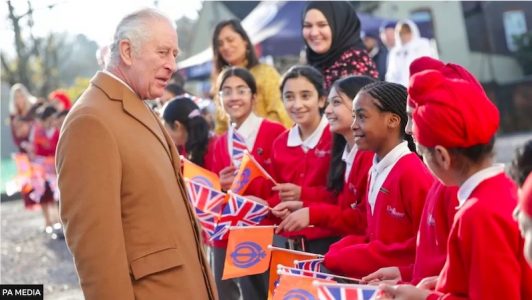 King Charles spoke with local schoolchildren outside the Guru Nanak Gurdwara