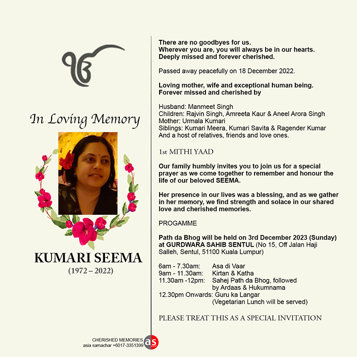 Our family humbly invites you to join us for a special prayer as we come together to remember and honour the life of our beloved SEEMA.